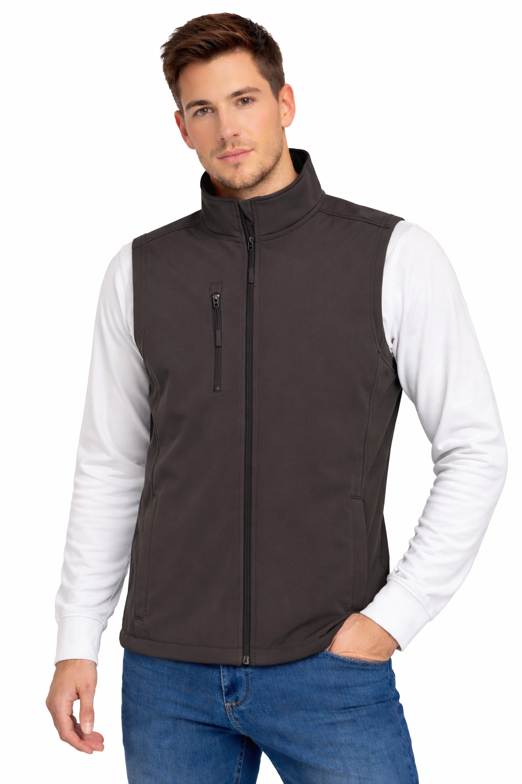 Сивата мъжка без ръкави софтшел жилетка е практично допълнение към работното и медицинско облекло за мъже, които се нуждаят от комфорт, свобода на движение и защита от студ. Това е модел, който се доказва както на работа, така и по време на ежедневните задачи, особено когато пълният яке е твърде топло. Този без ръкав без ръкави осигурява удобство, естетичен вид и функционалност при променливи условия.