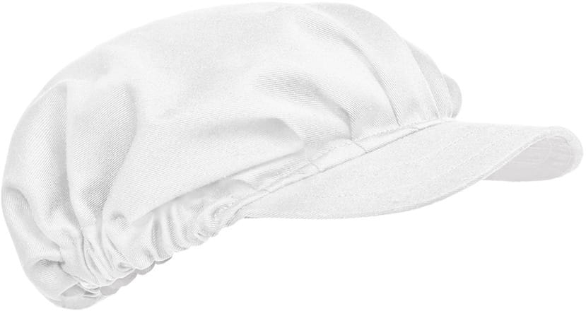 Белата кухненска пекарска шапка с козирка е практичен елемент от работното облекло, предназначен за работа в гастрономията, пекарната, сладкарницата и хранително-вкусовата промишленост. Моделът тип гетсби съчетава естетичен вид с удобство за ежедневна употреба. Благодарение на еластичния обиколка, шапката се прилага добре към главата и помага за контрол на косата по време на работа.