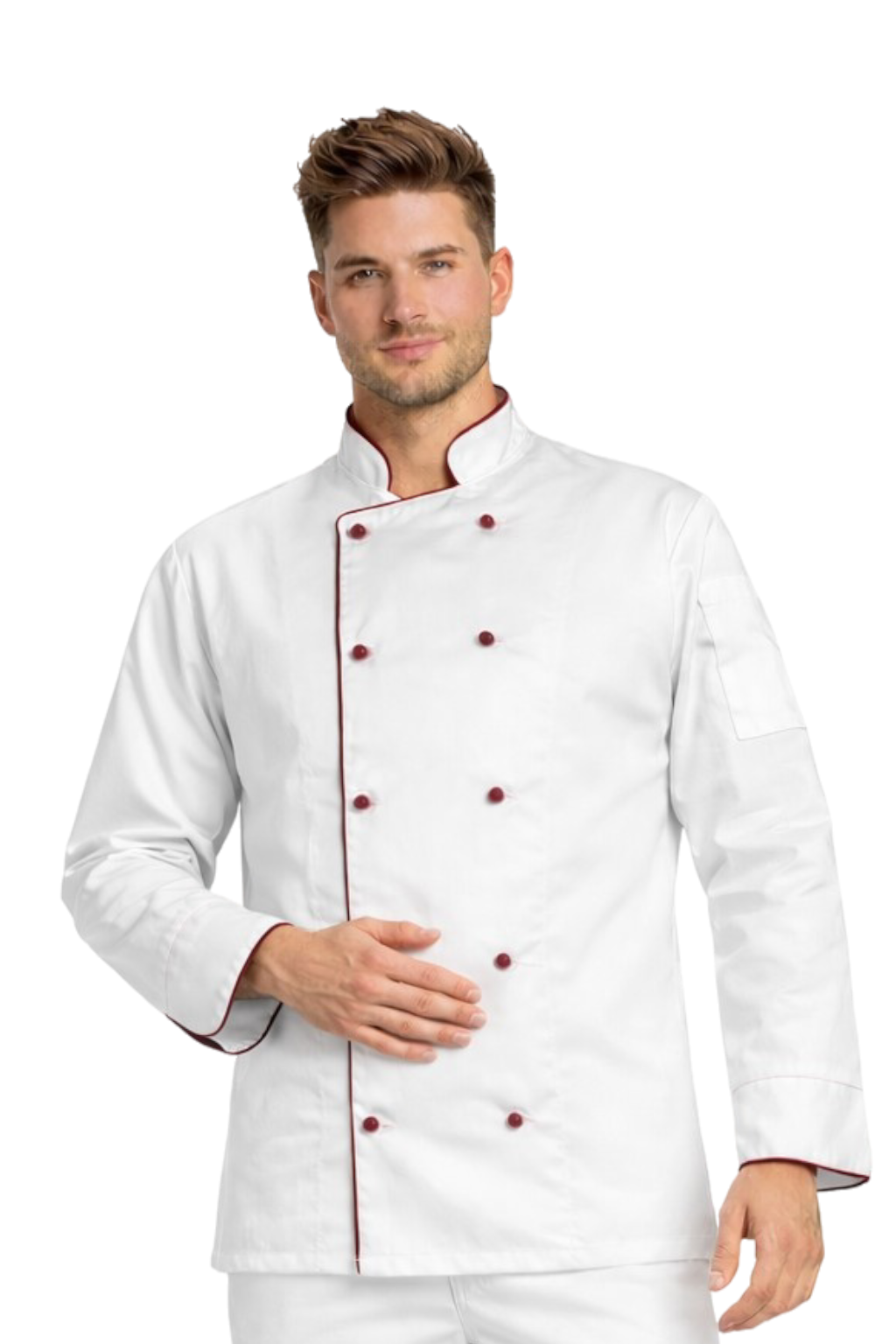 Професионалният мъжки готварски потник в бяло с бордо кант е висококачествен гастрономичен кител, създаден с мисъл за готвачите, кухненските помощници и шеф-готвачите. Елегантният външен вид, съчетан с функционалност, прави този потник идеален за употреба в ресторанти, хотели и кейтъринг фирми.