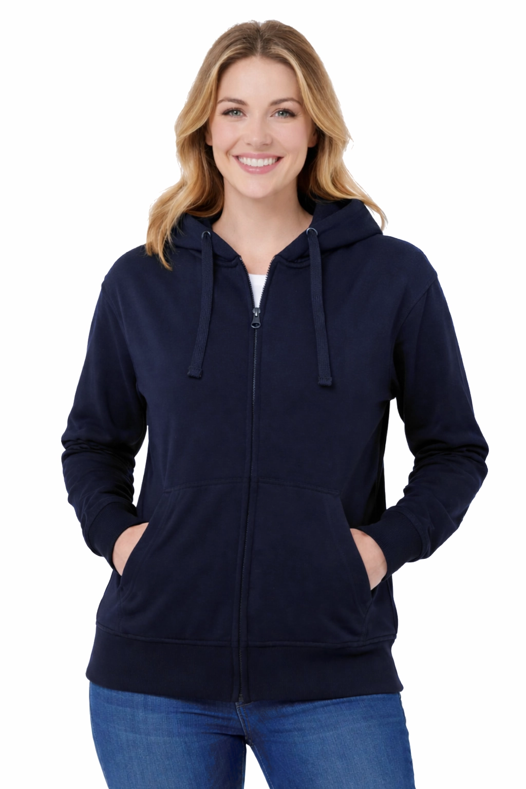 Дамска блуза с качулка на цип, изработена от мека и приятна на допир плат от типа френски тери, е перфектното съчетание на комфорт, издръжливост и модерен стил. Моделът е оборудван с практичен джоб тип кенгуру, който е подходящ както за съхранение на дребни предмети, така и за затопляне на ръцете. Регулируемата качулка с приспособени връзки, както и еластичните маншети на ръкавите и в долната част на блузата осигуряват удобно прилягане и защита от студа. Универсалният крой прави блузата идеална за ежедневни комбинации и активности на открито.