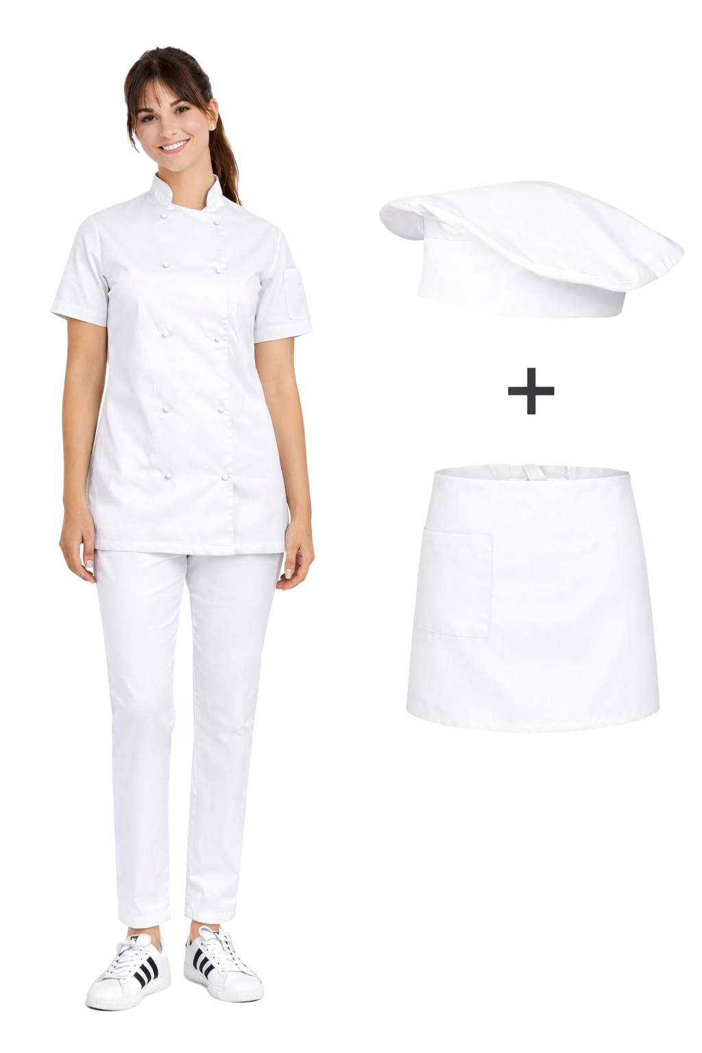 Дамския комплект готварски униформи е общ комплект от хранително-вкусови дрехи, проектиран с мисъл за професионалистите, работещи в изискващата кухненска среда. Съчетава функционалност, удобство и естетичен, пристойен вид, което спомага за положителния прием на персонала от клиентите.