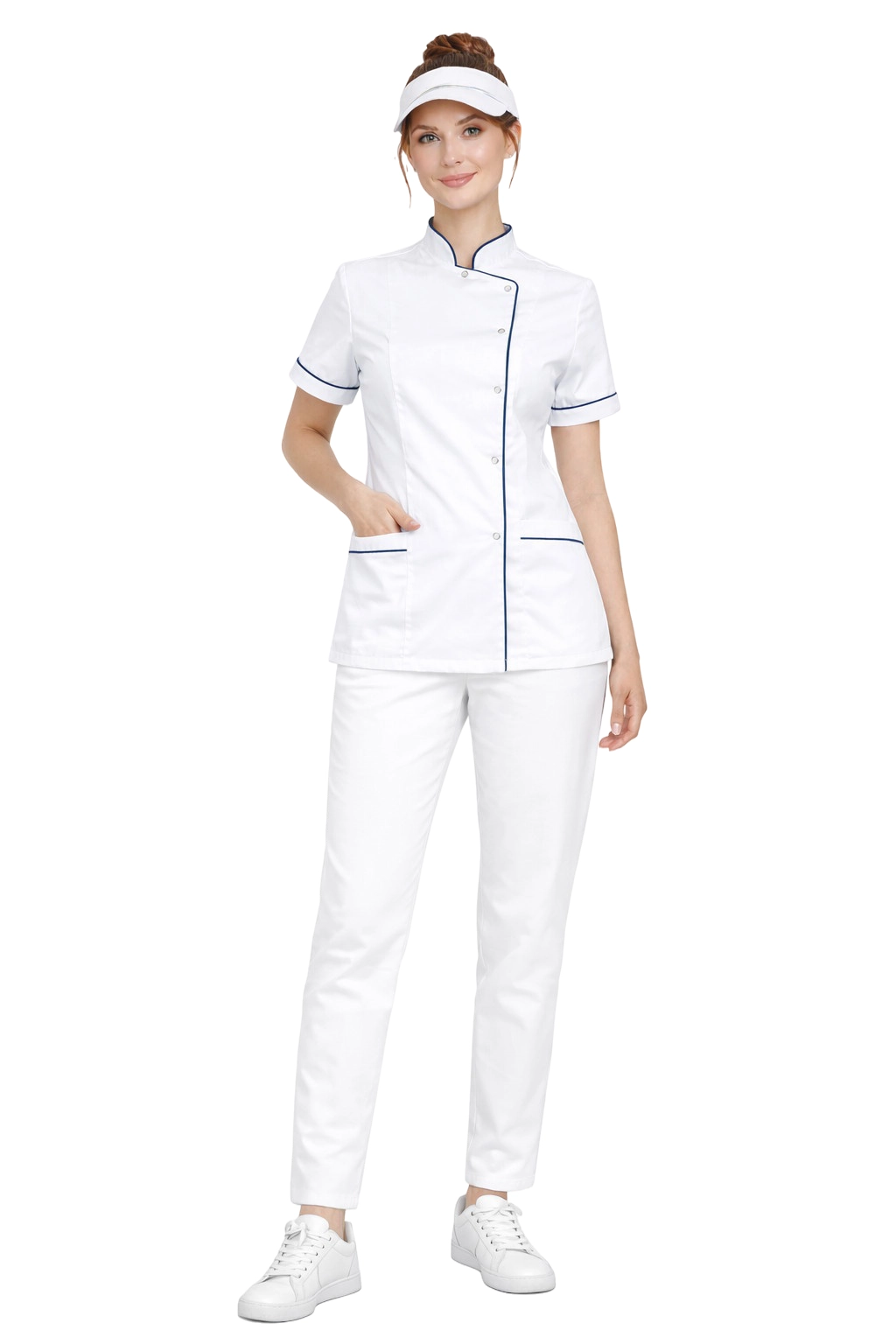 Дамски готварски комплект - бял престилка с тъмносиня кантарика, панталони тип "цигара"