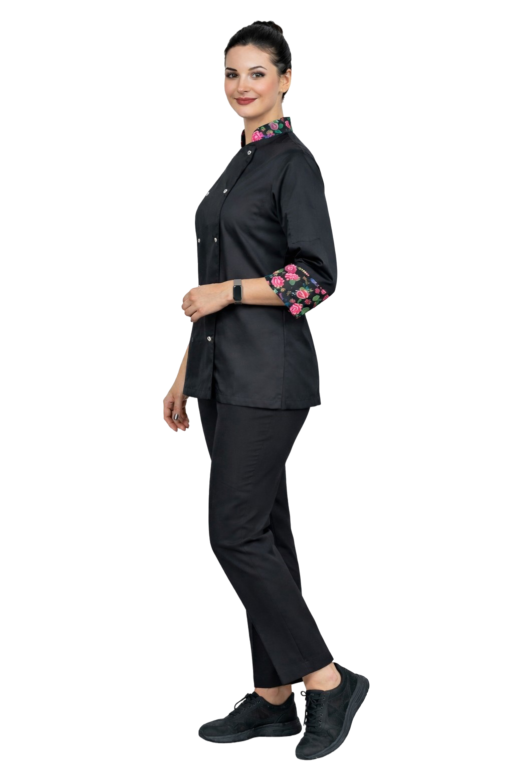 Блузата е проектирана в женствено скроена и обло оформена кройка, която подчертава силуета, без да ограничава свободата на движение. 3/4 ръкавът е практично решение в кулинарната работа - осигурява комфорт и естетичен вид.