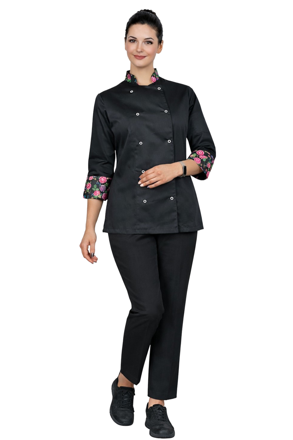 Женски кулинарски комплект, състоящ се от обло гащеризон с ръкав 3/4 и удобни кулинарски панталони, комбинира професионален вид, издръжливост и женствен стил. Комплектът е разработен, като се мисли за жените, работещи в гастрономията, които очакват комфорт и естетика по време на интензивен работен ден.
