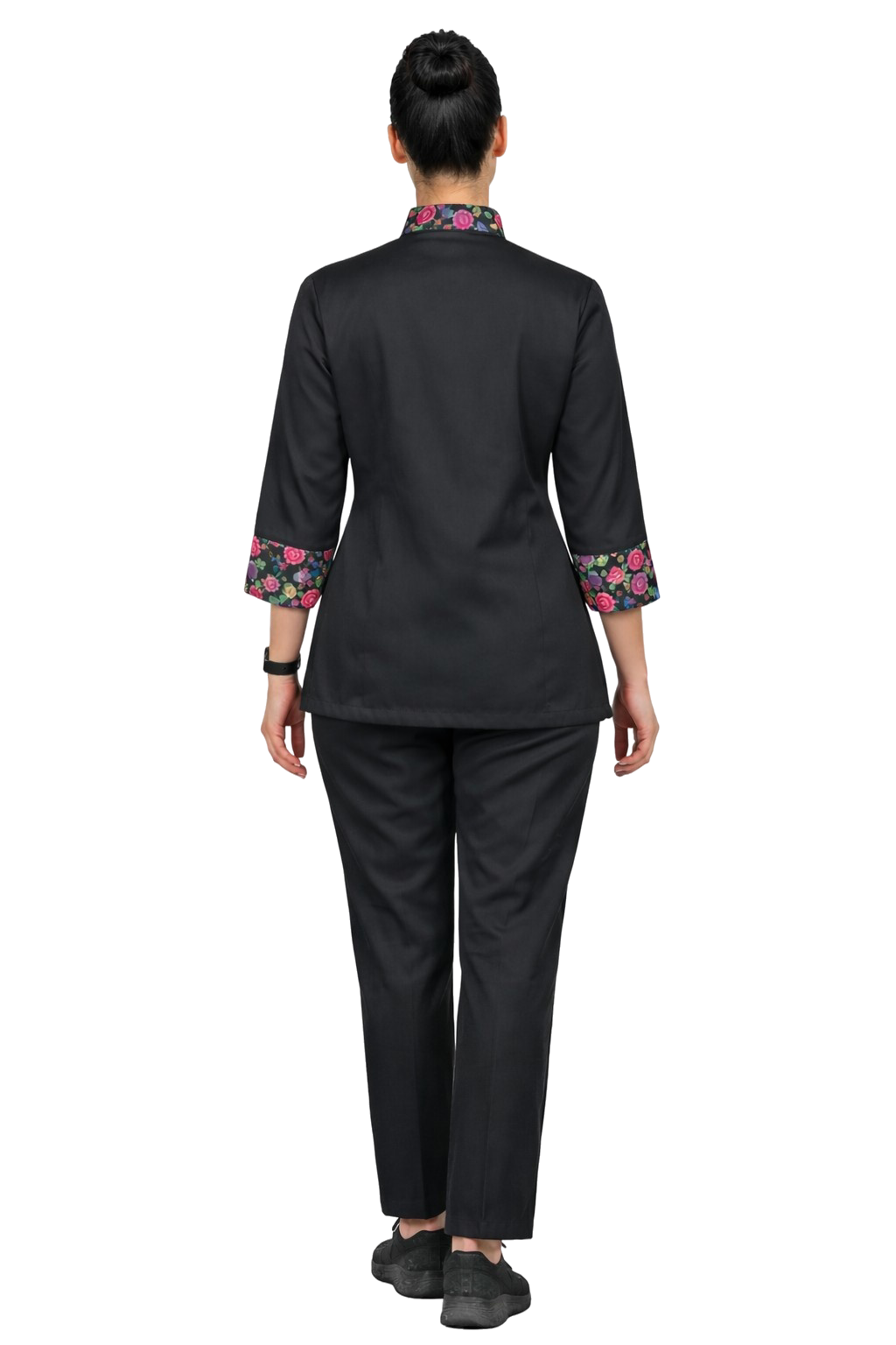 Декоративни вмъквания с цветарски мотив придават на комплекта уникален характер, а модерният крой на joggers подчертава динамичния стил на работа в кухнята.