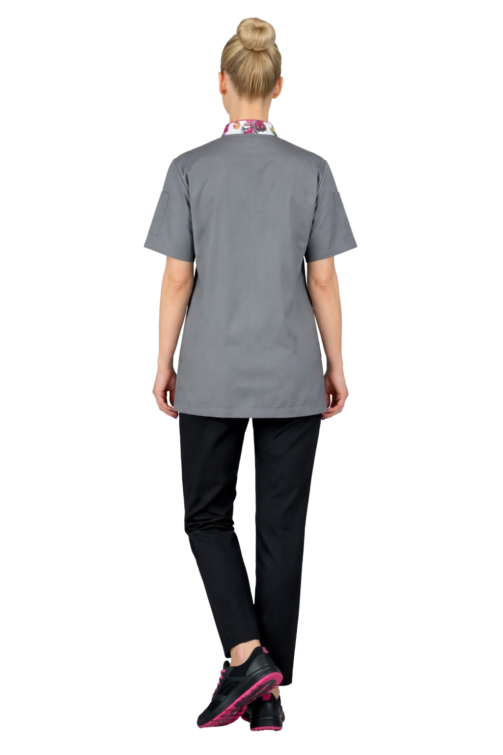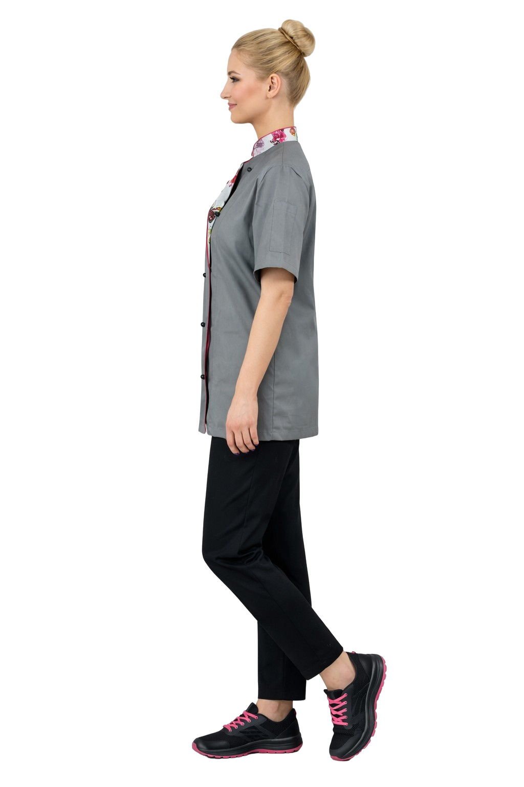 Блузата е дизайнирана в стволна форма, която красиво подчертава фигурата и осигурява естетичен вид по време на работа. Късият ръкав и леката, прохладна материя гарантират комфорт дори при високи температури в кухнята.