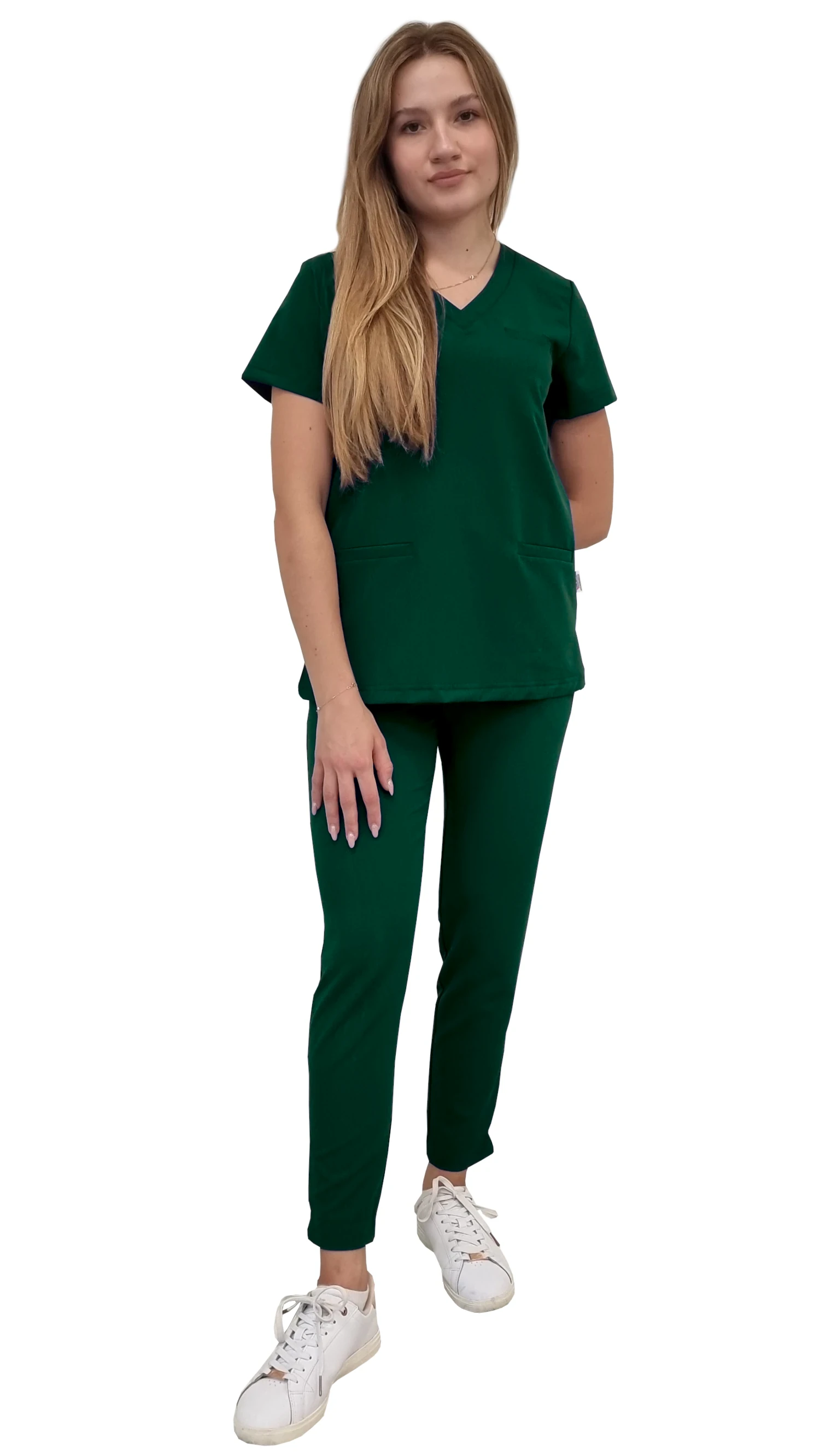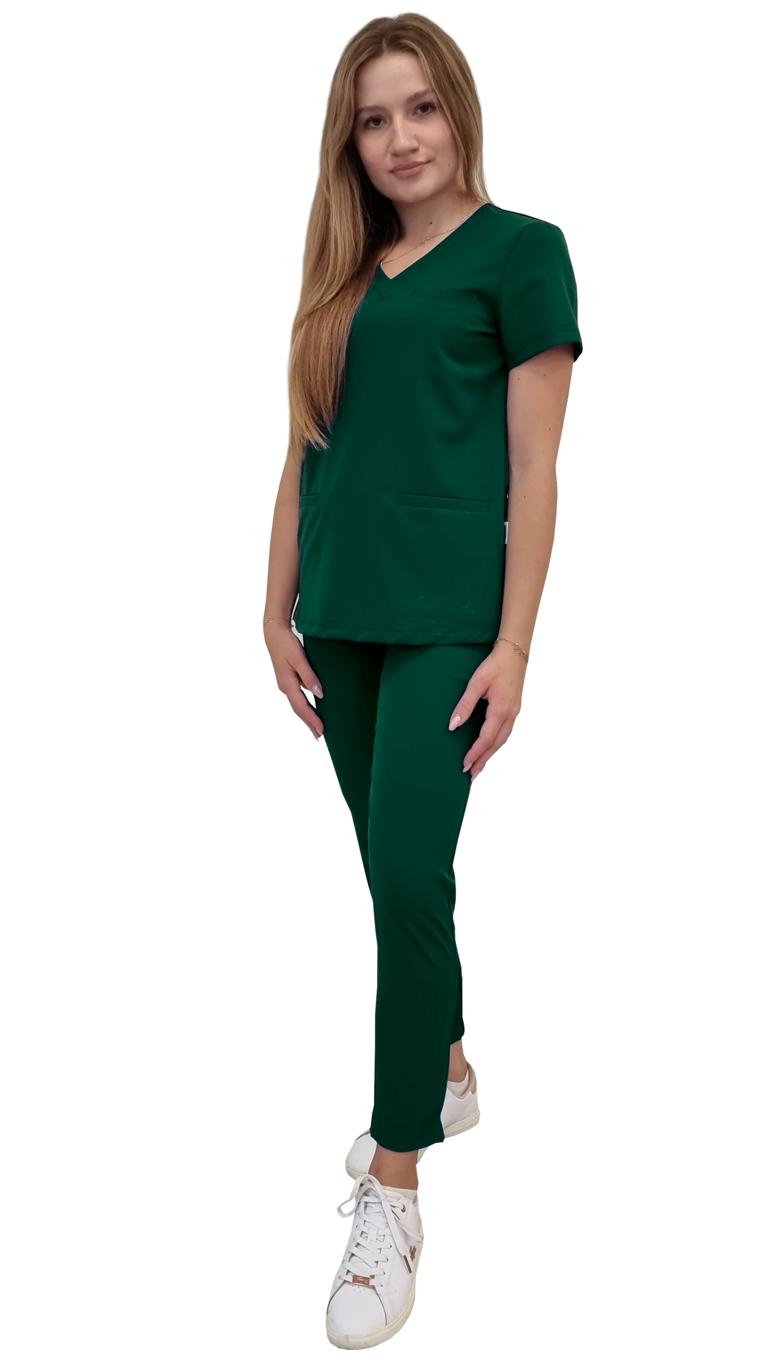 Медицинска униформа за жени BASIC PREMIUM в цвят зелена бутилка е професионален комплект, който съчетава модерен стил, удобство и висококачествена материя. Комплектът включва медицинска блуза BASIC PREMIUM и медицинско долнище BASIC PREMIUM, които заедно образуват надеждни scrubs за работа в медицинския и красотологичния сектор.