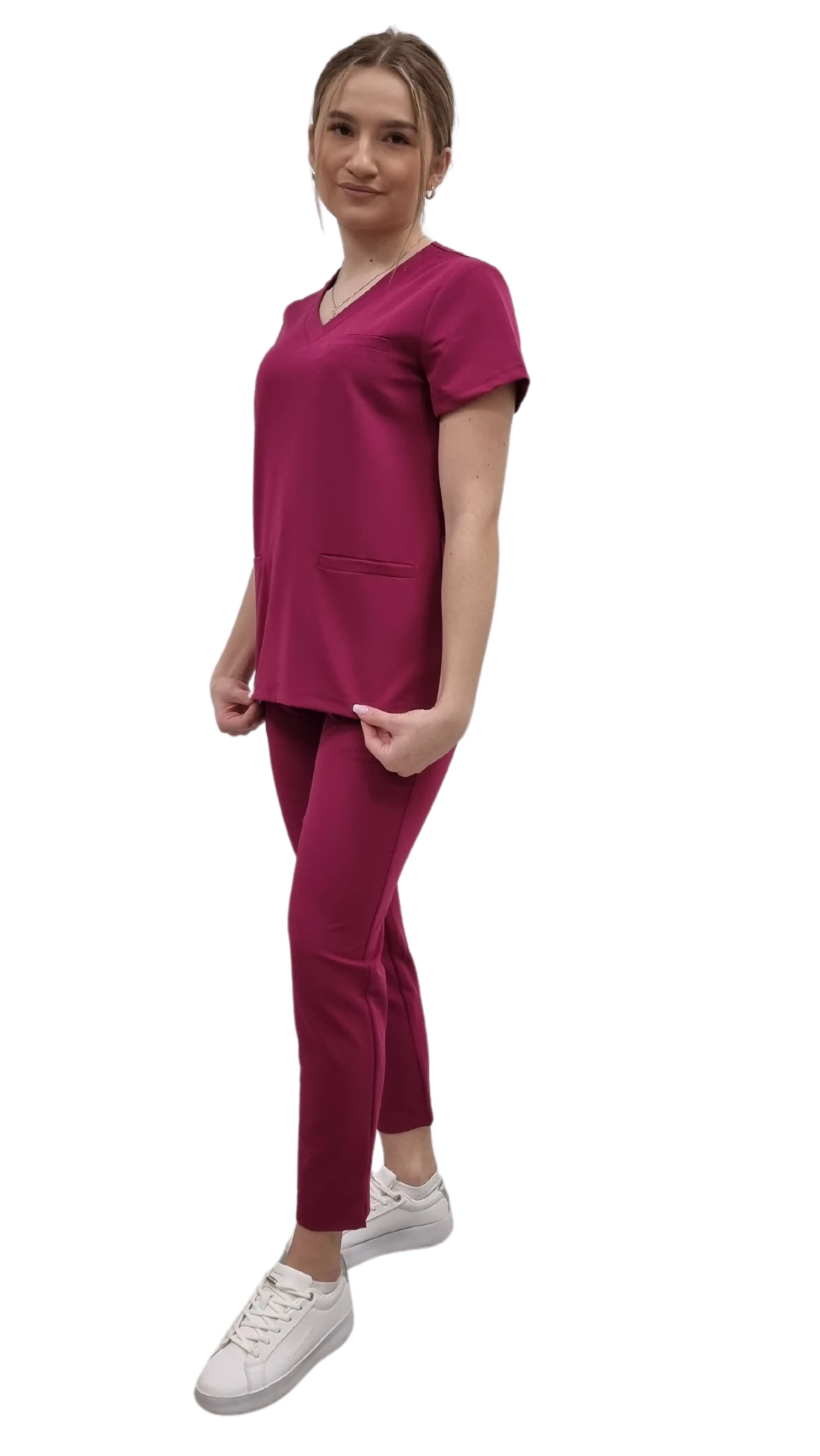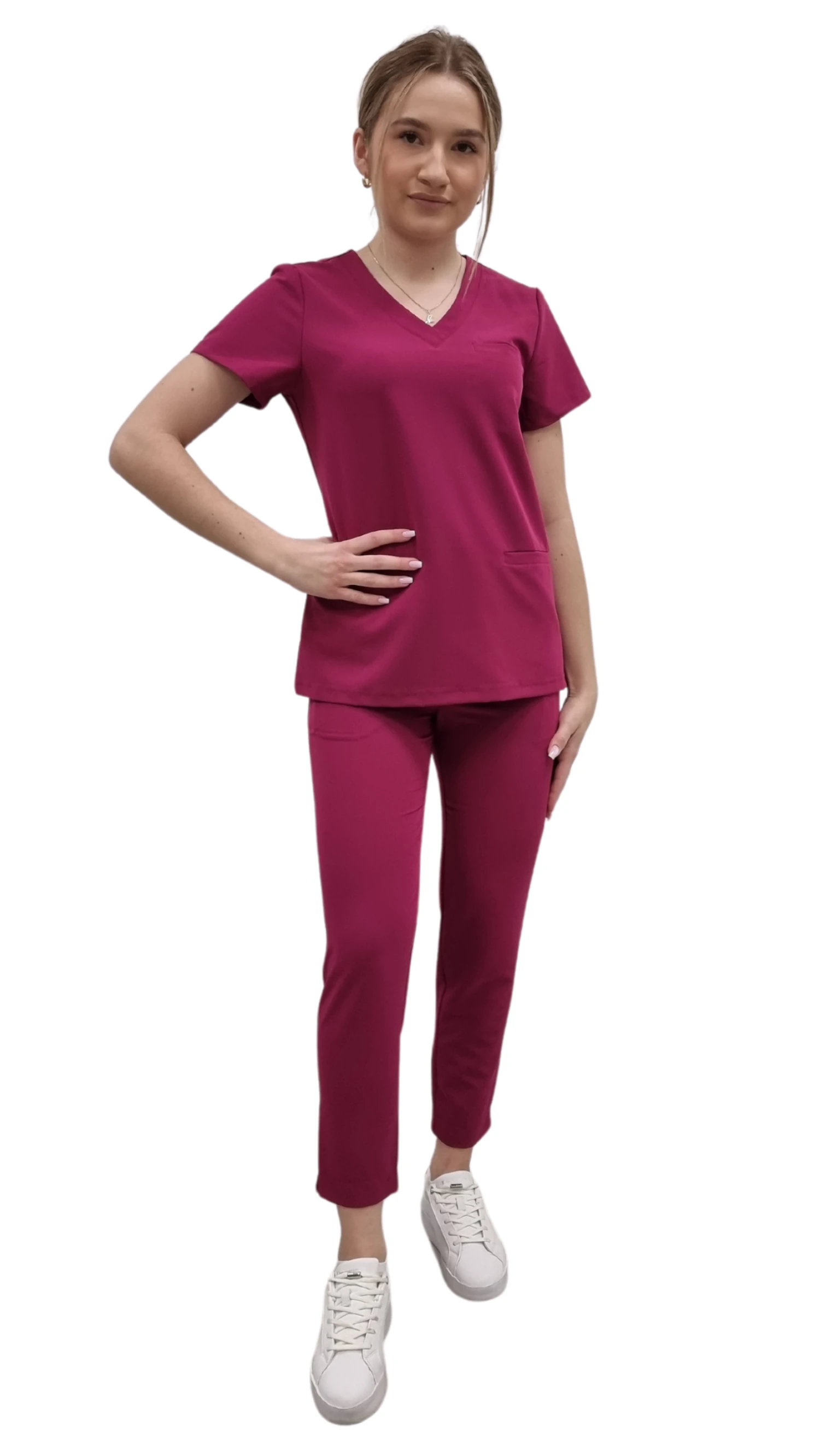 Медицински дамски униформa BASIC PREMIUM в цвят вишнев е професионален комплект, който съчетава модерен стил, комфорт и високо качество на тъканите. В състава на комплекта влизат медицинска блуза BASIC PREMIUM и медицински панталони BASIC PREMIUM, които заедно съставят надеждни scrubs за работа в медицинския и козметичния бранш.
