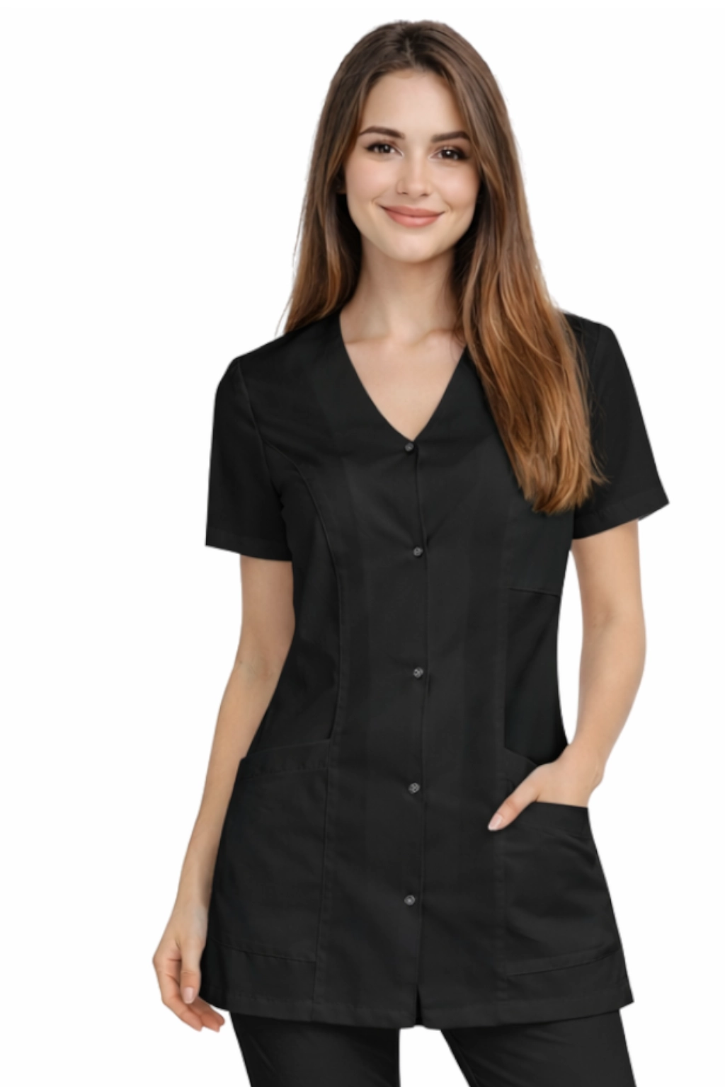 Класическата чернота придава на жакета вечна елегантност и универсалност. Това е цвят, асоцииран с професионализъм, чистота и добър стил, затова е подходящ за всяка учреждение. Жакетът лесно може да се комбинира с други елементи от медицинското облекло, създавайки единнообразен и естетичен униформа.