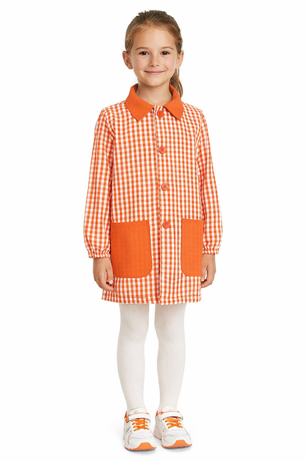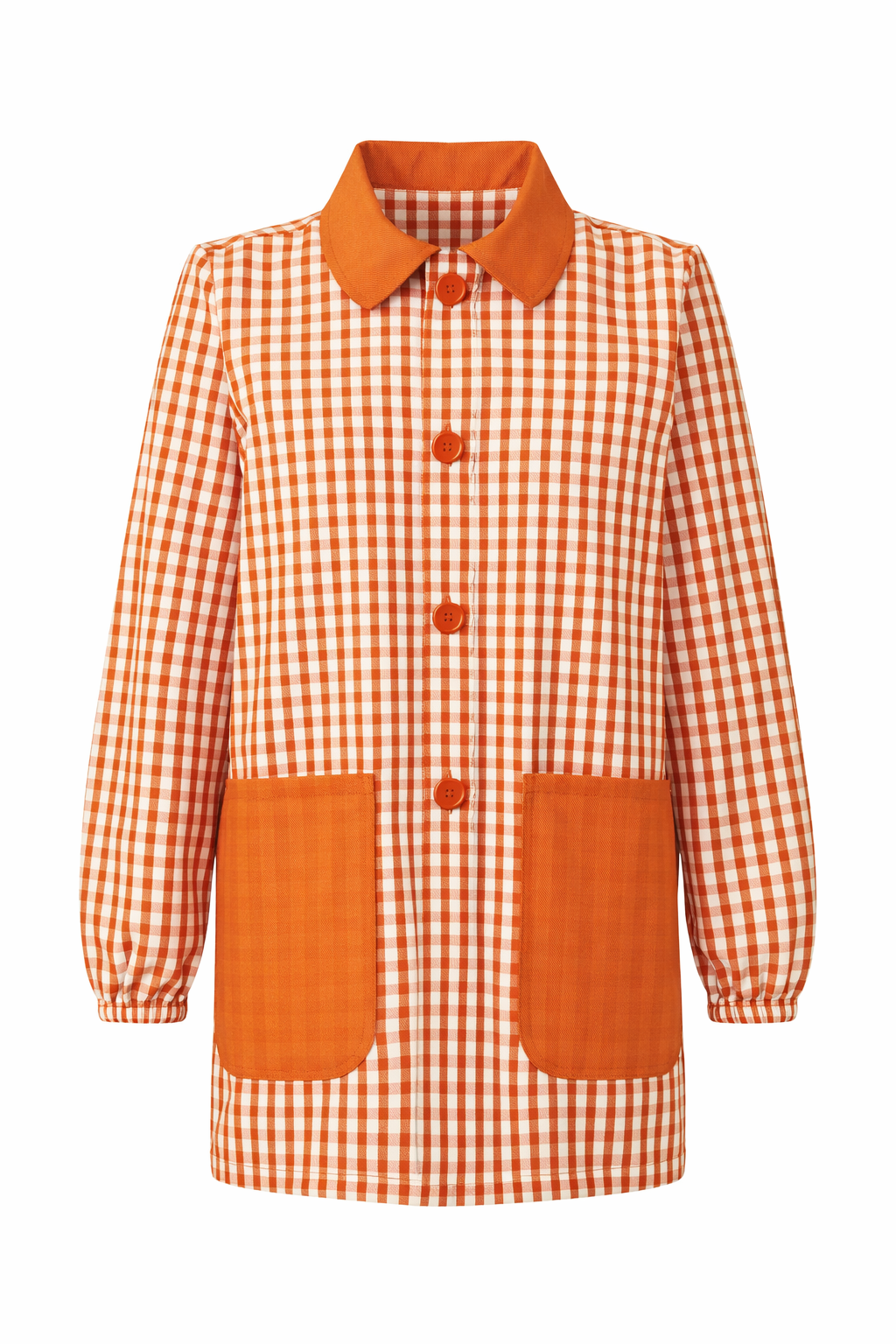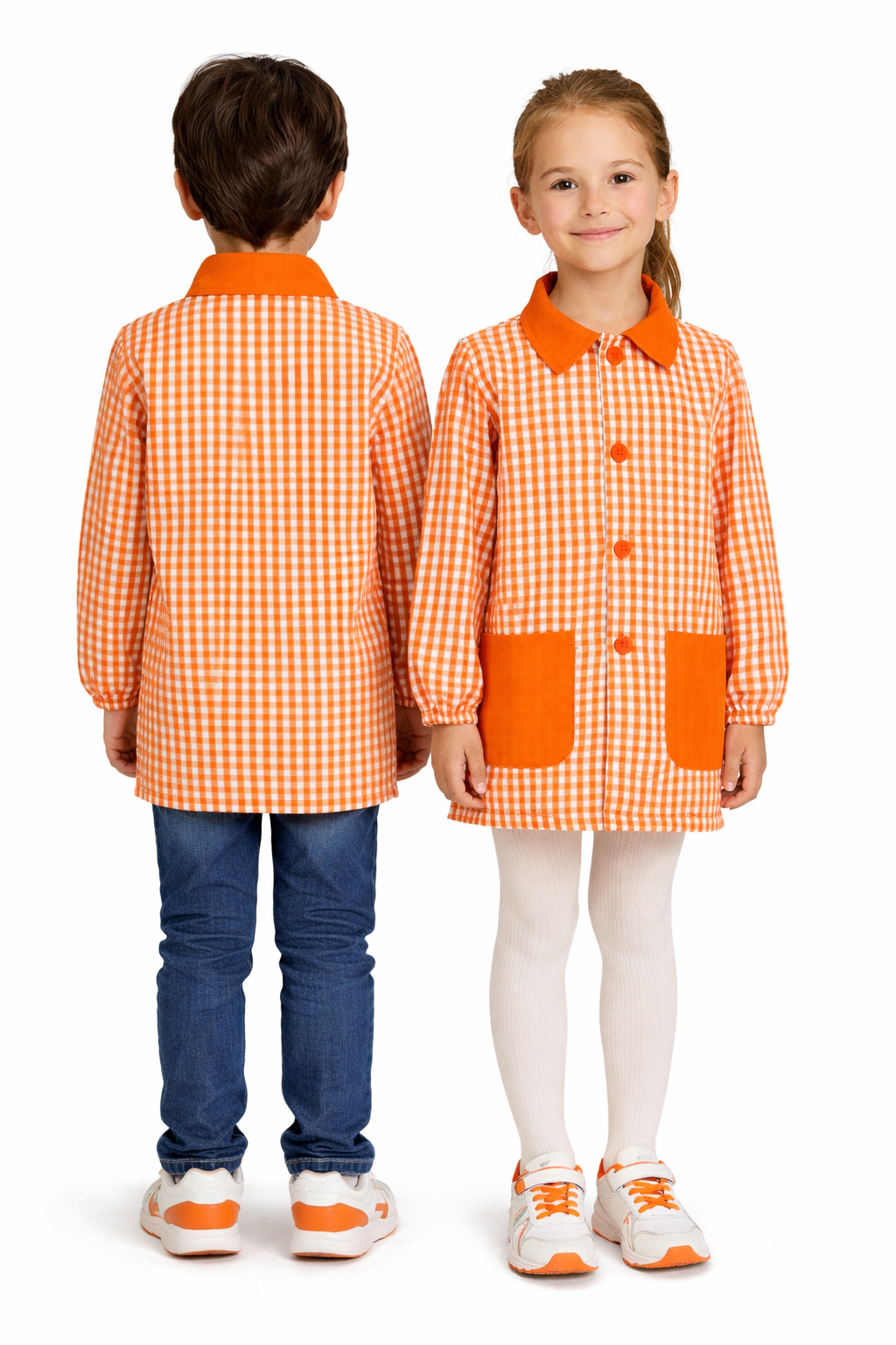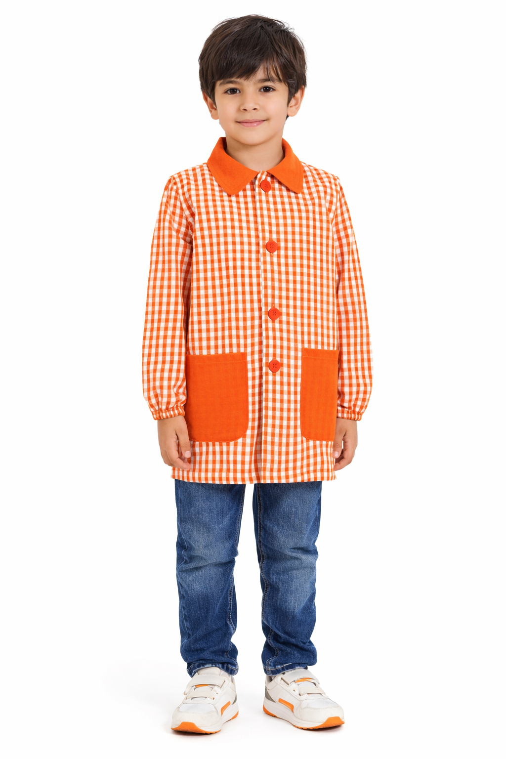 Оранжевата карирана детска предпазна престилка е практично защитно облекло за децата, посещаващи ясли, детски градини и училищни занятия. Защитава дрехите по време на ежедневни активности като изобразителни изкуства, рисуване, моделиране с пластилин или хранене. Класическата кройка с яка и удобните копчета правят престилката лесна за поставяне и комфортна за ежедневна употреба.