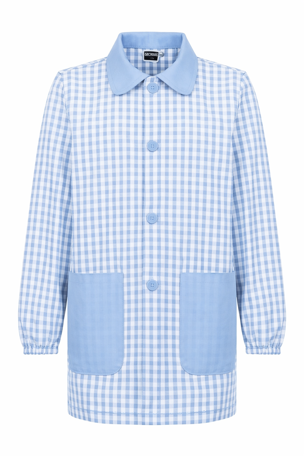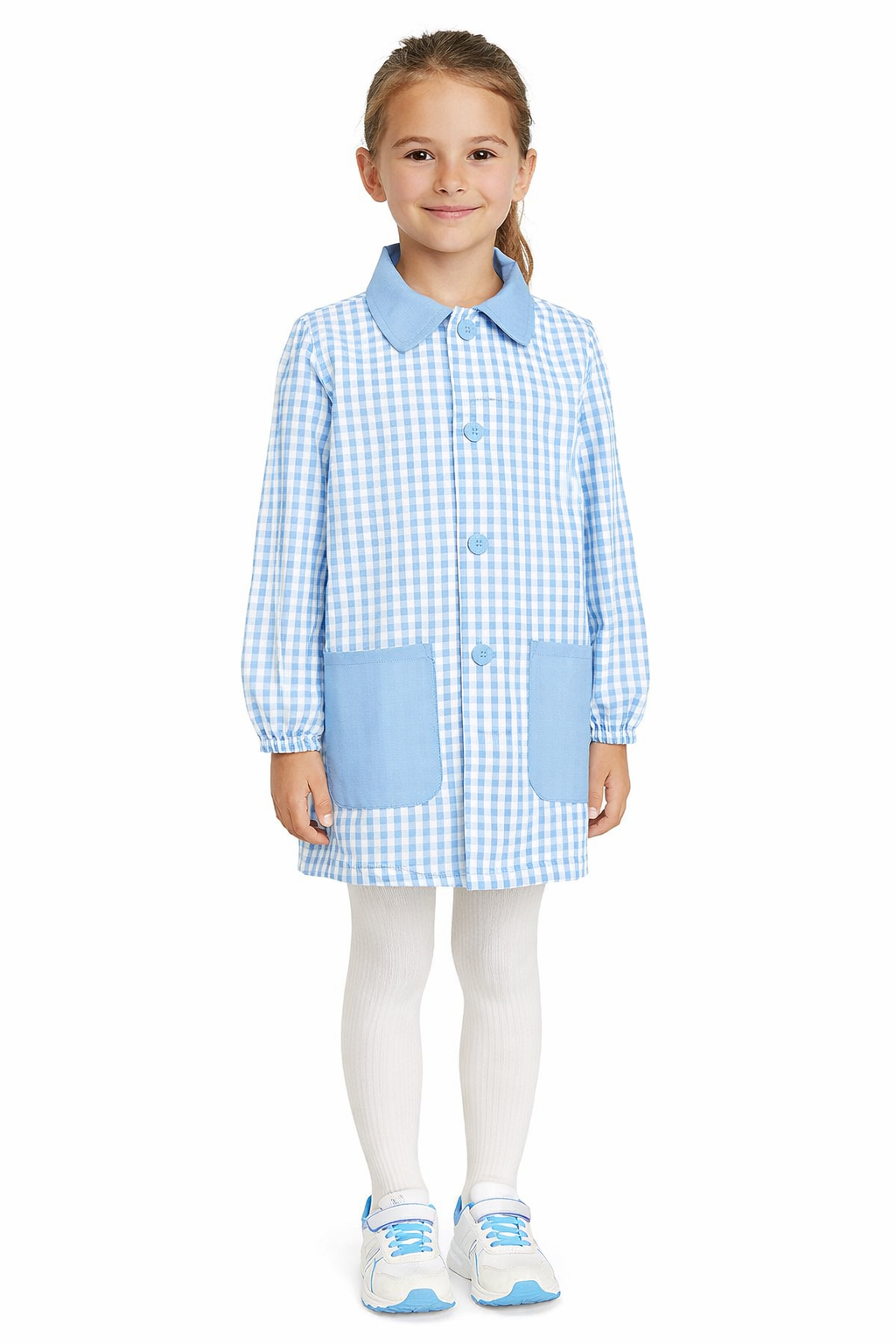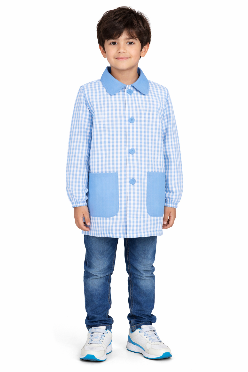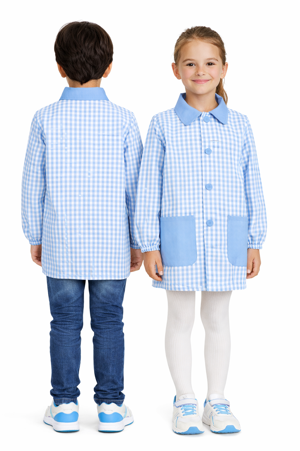 Детската синя карирана престилка е практично защитно облекло за деца, които посещават ясла, детска градина или школа. Защитава дрехите по време на ежедневни дейности като ученически занятия, рисуване, моделиране на пластилин или ядене на храна. Класическата кройка с яка и удобното закопчаване с копчета прави престилката лесна за обличане и комфортна за ежедневна употреба.