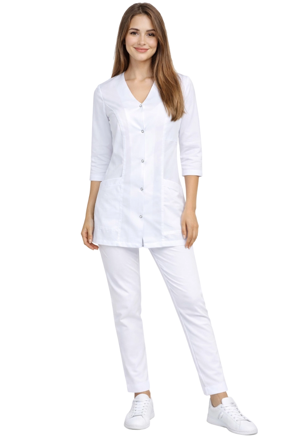 Елегантният, талииран крой с къс ръкав подчертава фигурата и осигурява комфорт при носене през целия ден. Закопчаване с копчета улеснява бързото обличане и сваляне, а трите практични джоба (два в района на бедрата и един на гърдите) позволяват да имате най-необходимите аксесоари винаги на разположение.