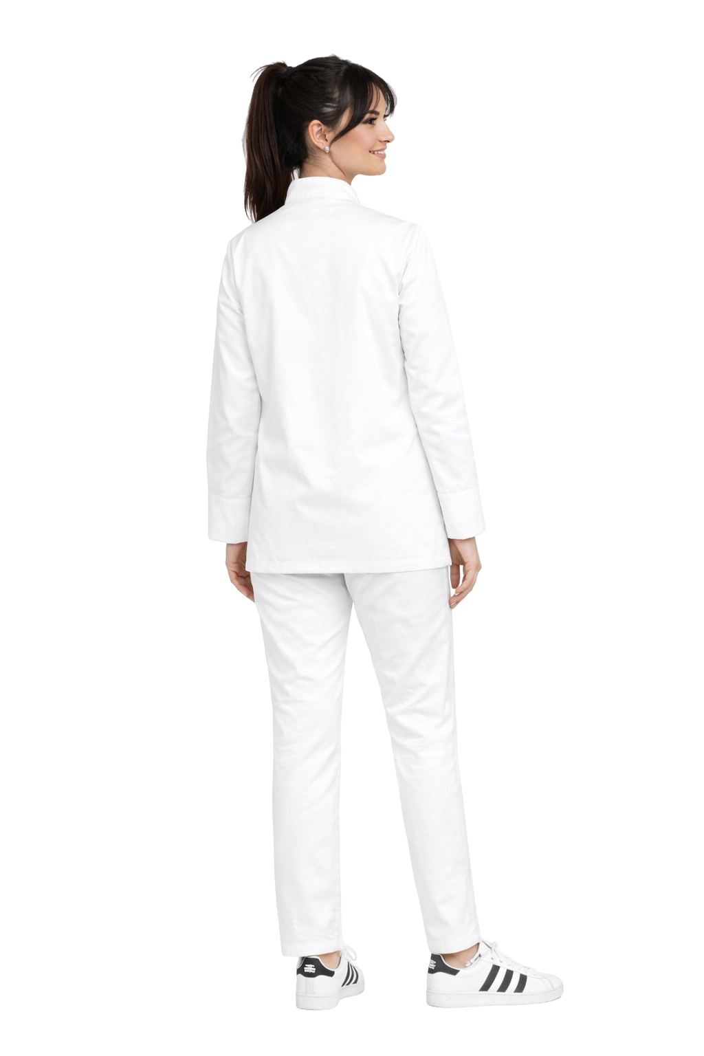 Сигара панталоните със заострени крачоли придават на комплекта модерен, елегантен вид. Еластичният колан с ластик и връзки осигурява идеалното прилягане и удобство по време на стояща работа.