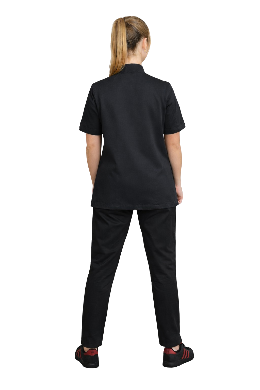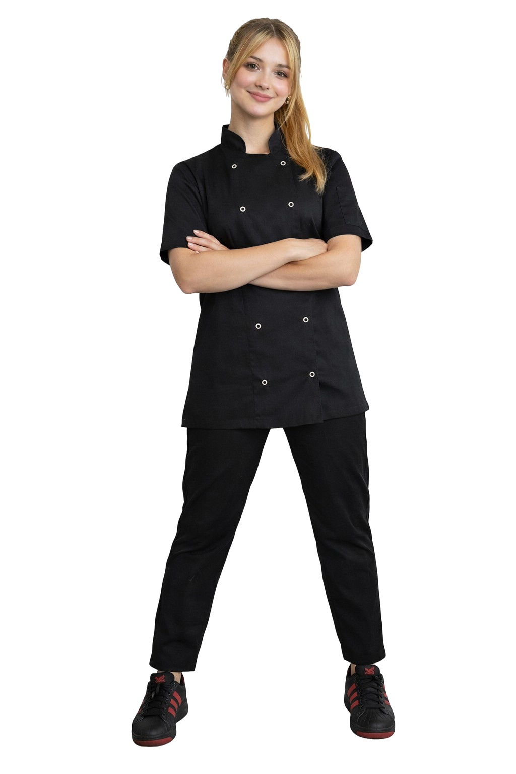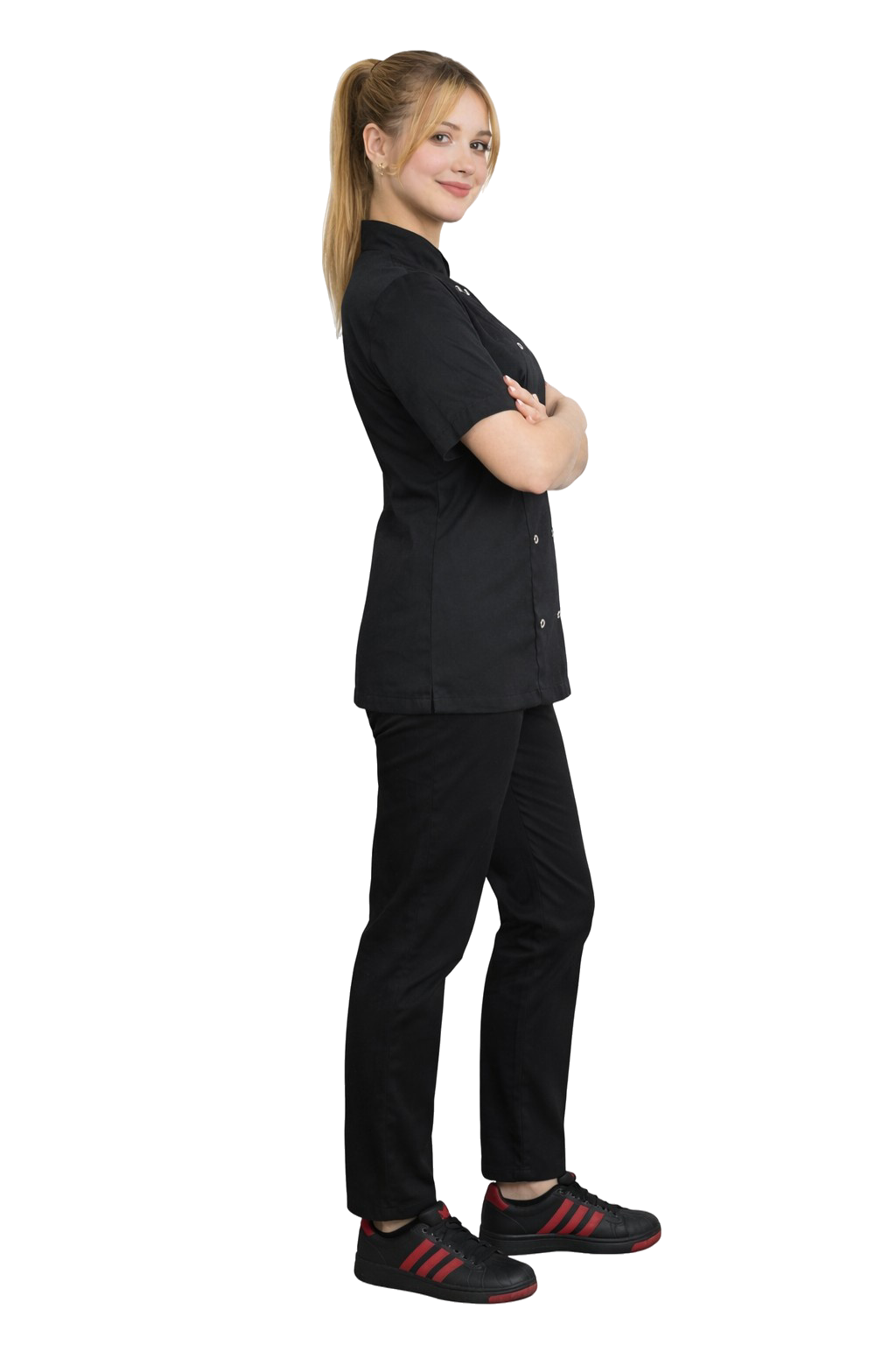 Дамски комплект шефски облекло, състоящ се от сак с подчертана талия и удобни шефски панталони, е идеалното решение за жени, работещи в гастрономията. Комплектът съчетава професионална визия, здравина на материалите и комфорт при носене по време на дълготраен труд.