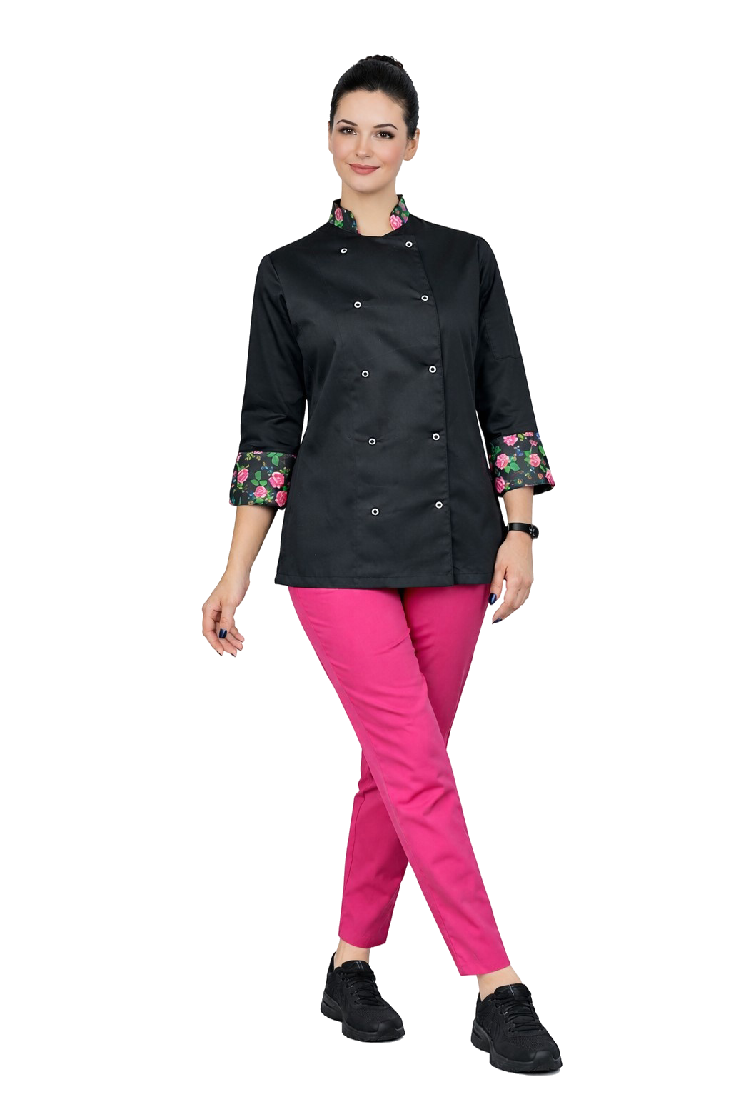 Дамски комплект готварски екип, състоящ се от прилепнал лабар, с ръкав 3/4, и готварски панталон, това е модерен гастрономически униформа, създаден с мисъл за жените, работещи в професионалната гастрономия. Комплектът съчетава функционалност, комфорт и естетика, отговаряйки на високите стандарти, които са в сила в ресторантските кухни.