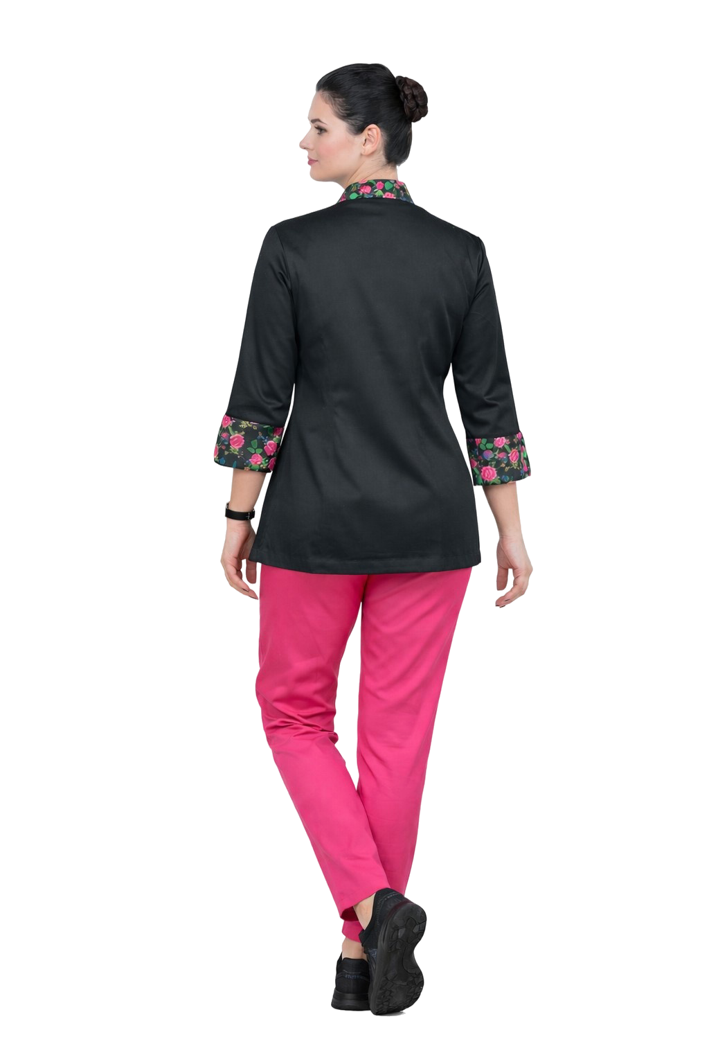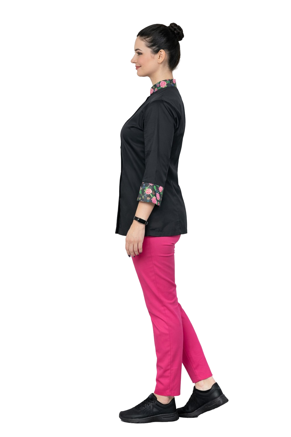 Уникален характер на блузата придават цветни вложки на яката и маншетите, изработени от 100% памук, които суптилно подчертават женствения стил на униформата.