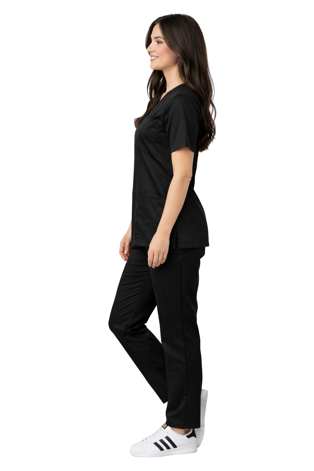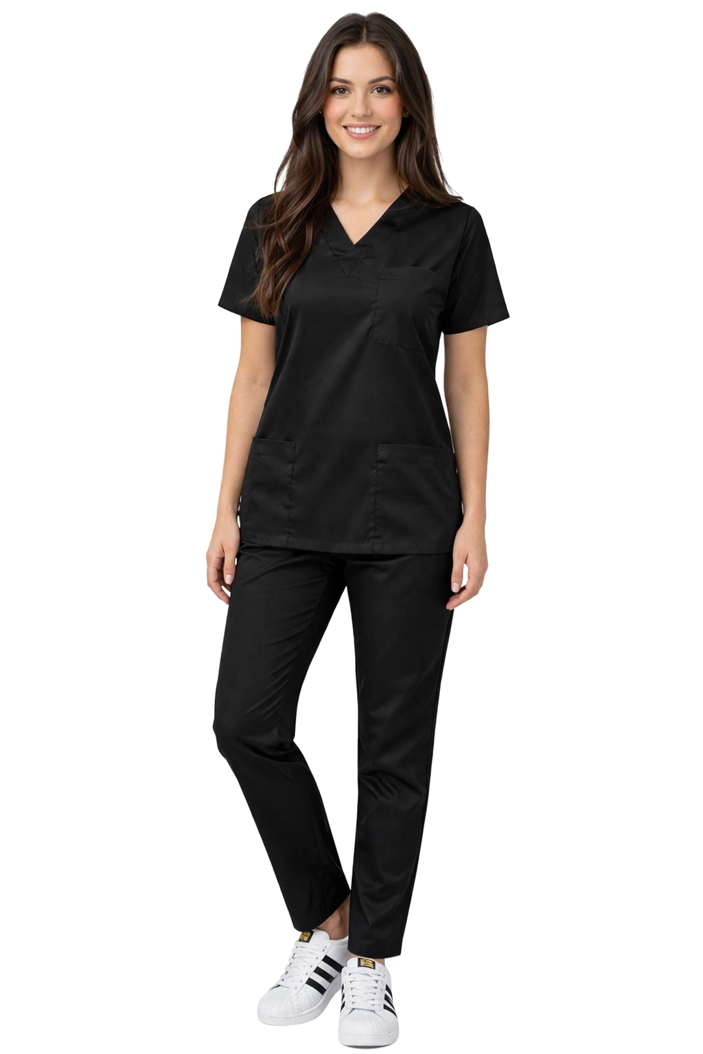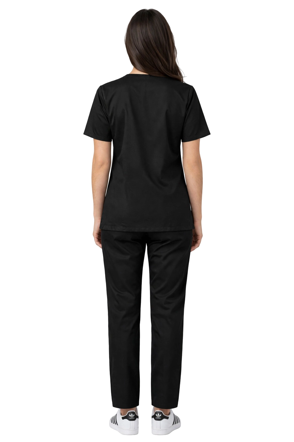 Минималистичният черен цвят придава на униформата професионален и елегантен вид. Затова комплектът е идеален за клиники, лекарски кабинети, стоматологически, ветеринарни и други медицински заведения.