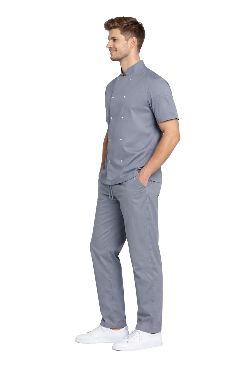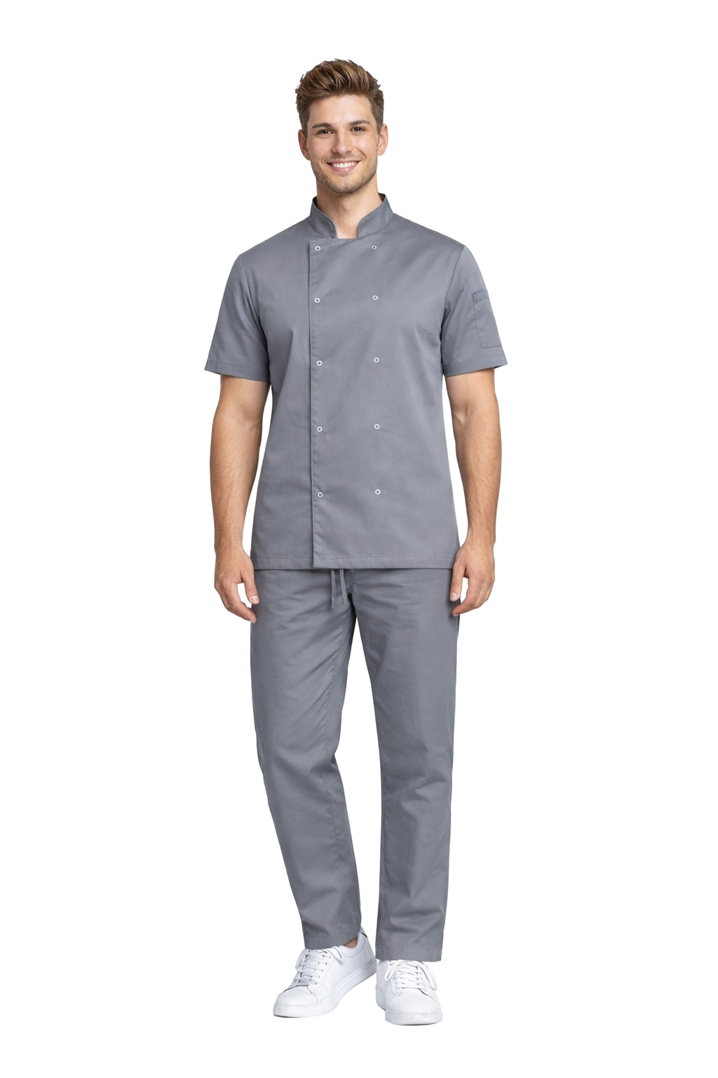 Благодарение на използването на плат с добавен еластан, комплектът осигурява висок комфорт на работа, естетичен външен вид и пълна свобода на движение, което е от ключово значение в динамичната среда на кухнята.